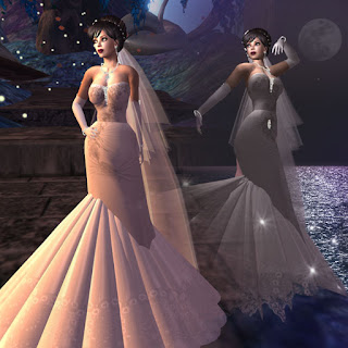 The bodice is exquistely detailed with soft delicate lace embellishments, hand crafted beading, diamonds and pearls. To help keep your mermaid gown in place a specially built AO has been built in the pearl tear drop broach (this can be turned off by touch). The gloves each feature an embellishment of pearls and diamonds with cascading teardrops.